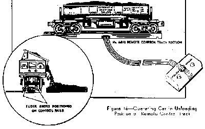 The mechanism of most unloading cars, such as the Milk Car and the Coal and Lumber Dump Cars, is powered by a built-in electrical coil, or solenoid which gets its current from the track through the two sliding contact shoes on the bottom of the car. To operate such cars position them on the remote control section so that both contact shoes rest on the auxiliary control rails (See Figure 16). Then press "Unload" button on the controller.