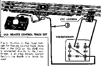The Remote Control Section is usually supplied with track voltage. It is possible, however, to connect it so that it will receive a fixed voltage directly from the transformer. To do that one of the four wires leading from the controller must be disconnected from the remote control section, and connected instead to a fixed voltage post on the transformer. On UCS sections this wire is No. 3; on 6019 section, it is No. 4. The transformer connections for such an installation are the same as for the Fixed Voltage Plug on 022 Switch (see Using Track and Switches)