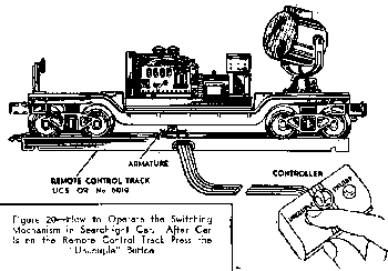 Operating cars such as the Animated Box Car and the Searchlight Car do not make an electrical connection to the auxiliary rails. Instead, their mechanism is operated when the iron plunger, or armature, projecting from the bottom of the car is attracted by the electro-magnet in the remote control section. To operate these cars position them on the remote control section so that the plunger is directly over the electro-magnet (See Figures 17 and 20); then press the "Uncouple" button of the controller. Cars can be operated either while they are standing or in motion, by pressing the controller button at the right moment. In the Animated Box Car, to get the man back into the car shut the open door by hand. In the Searchlight Car the light will continue burning until the car is moved back to the remote and operated again.