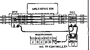The two dumping sides of this car tilt alternately, rising a notch every time the controller button is pressed. If you are unloading the car into a track-side storage bin, Loader or Coaling Station, you will have to move the car over about one-half of its length after one side has been dumped so that the second side can he dumped into the same bin. For this reason, the regular remote control track sections are too short and 2 OTC contactors are furnished.