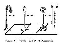 In the event you have several voltage it is advisable to use the all of them, wiring them together in "parallel" as shown in Figure 47. Two main feeders go to the transformer posts and individual wires go from these feeders to the accessories. In this way unnecessary wiring is eliminated.