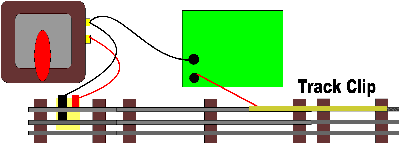 Here it is simple: one wire to the transformer, the other to a rail clip. The clip is placed toward the direction of rail traffic. |