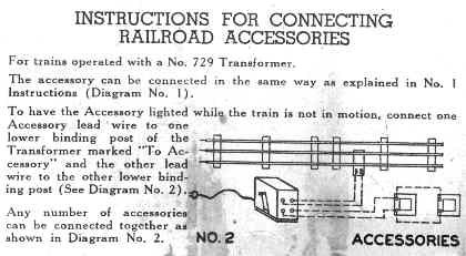 Marx lighted accessories, such as street lamps, searchlights, floodlights and lighted stations are very easy to wire. These have two terminals. Hook each terminal to one of the accessory terminals o nthe transformer. Don't hook them to track power, as every time you stop the train, the lights go out. (We included original Instruction #1 for sake of completeness.)