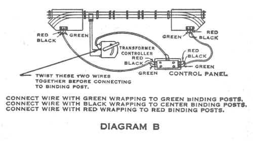 Marx switches are simple. Whether the old all-metal or new plastic types, their wiring is similar to that found in two-rail switches. Three wires go to the switch itself. These are red, green and black. Black is the center wire, and it functions as a "ground," of sorts. Inside the switch is a solenoid. When the controller button is pressed, a circuit is completed that invokes the solenoid, thus operating the switch. The red and green wires determine the polarity, making the solenoid pull to one side or the other.