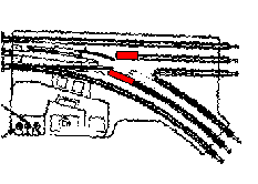 The trick to using older Marx switches with Lionel trains is to inset track pins as shown (red). They must extend without impeding the operation of the switch. |