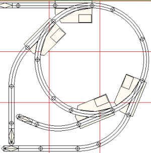 Circle with two spurs and two sidings. With short cars and small locomotives or motorized units, you can combine trolley / commuter work with industrial type freight shunting. Our example is scenery at the edge of town. (4) Lionel® O27 single straight (6) Lionel® O27 O-27 curve 45° (2) Lionel® O27 O-27 lefthand turnout (2) Lionel® O27 O-27 half curve 22.5° (4) Lionel® O27 track bumper (2) Lionel® O27 O-27 righthand turnout (1) Unknown track section (3) Lionel® O27 half straight |