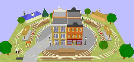 This extended loop can host many types of rail operations. Our town center and suburban scenery is evocative of a commuter / trolley system. (12) Lionel® O27 O-27 curve 45° (4) Lionel® O27 half straight (2) Lionel® O27 O-27 righthand turnout (2) Lionel® O27 O-27 lefthand turnout |