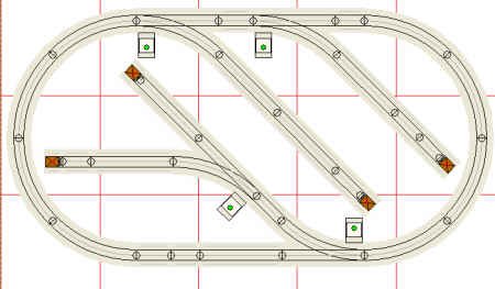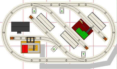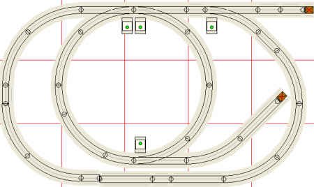 Our first railway is a simple "loop in a loop" with two very small sidings. The siding on the lower left is so small it can only handle the shortest cars. Insulate it off, and you can park a hand car there. It will also handle short cars such as ore cars. The only problem you will have is the switch machine on the lower left switch. If you have hobby skills, you might be able to trim the adjacent roadbed, move the machine or alter the machine housing. If not, replace the switch with a curve, and omit the small siding. (3) MTH 40-1001 10 inch straight (13) MTH 40-1002 O-31 curve (3) MTH 40-1018 3.5 in straight (2) MTH 40-1005 O31 lefthand switch (2) MTH 40-1004 O31 righthand switch (2) MTH 40-1016 5.0 in straight (2) MTH 40-1024 track bumper (1) MTH 40-1017 4.25 in straight |