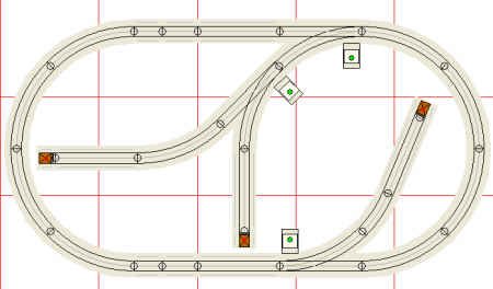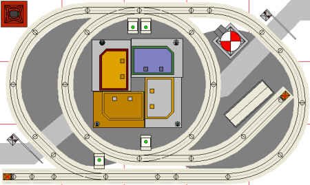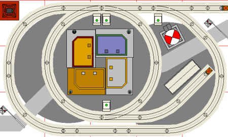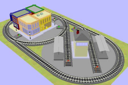 If you cannot mitigate the switch machine but want to keep the siding, here is a variant plan. The scenery and track plan are almost identical, but the switch and siding have been moved to the upper right corner. As with the above layout, we have depicted an urban area which can host small freight or a commuter or trolley type operation. In both this and the above layout, sidings were placed so a bumper-activated car like a trolley can be reversed just by using track switches. (3) MTH 40-1001 10 inch straight (13) MTH 40-1002 O-31 curve (5) MTH 40-1018 3.5 in straight (2) MTH 40-1005 O31 lefthand switch (2) MTH 40-1004 O31 righthand switch (1) MTH 40-1016 5.0 in straight (2) MTH 40-1024 track bumper (1) MTH 40-1017 4.25 in straight |