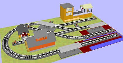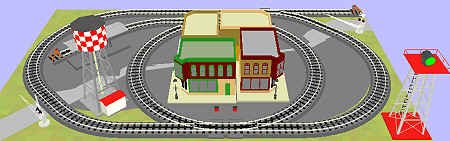 This tiny point-to-point railway is for an industrial-type dockside or freight operation. There is a bisecting bumper-to-bumper line for a trolley, "gang car" or similar reversing vehicle. We have portrayed a dockside railway with a small pier. (10) MTH 40-1001 10 inch straight (6) MTH 40-1002 O-31 curve (6) MTH 40-1024 track bumper (1) MTH 40-1018 3.5 in straight (1) MTH 40-1005 O31 lefthand switch (1) MTH 40-1004 O31 righthand switch (1) MTH 40-1017 4.25 in straight (1) MTH 40-1007 45° cross (1) MTH 40-1012 5.5 inch half straight |