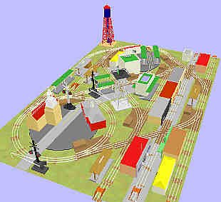 Loosely inspired by an old Marx track plan from the 1930s, this railway can blend freight and commuter / streetcar service. It also has a separate loop for a small motorized unit or tram. (8) Lionel® O27 single straight (9) Lionel® O27 O-42 curve 30° (15) Lionel® O27 O-27 curve 45° (1) Lionel® O27 O-42 lefthand turnout (2) Lionel® O27 O-27 righthand turnout (3) Lionel® O27 half straight (3) Lionel® O27 O-27 lefthand turnout (2) Lionel® O27 O-42 righthand turnout (4) Lionel® O27 track bumper (2) Lionel® O27 cut straight (1) Plasticville #1602 post office (1) Plasticville #1611 hardware store (1) Plasticville #1612 5 & 10 store (1) Plasticville #1853 drug store (1) Plasticville #1801 bank (1) Plasticville 1613 large super market (2) Plasticville 1620 loading platform (3) Plasticville 1200 station platform (2) Plasticville 1901 Union Station platform (1) Plasticville 1905 Town hall / Independence hall (1) Plasticville $1703 Colonial mansion (1) Plasticville 1701 New England ranch home (2) Plasticville #1502 Cape Cod house (1) Plasticville 1629 bungalow house |