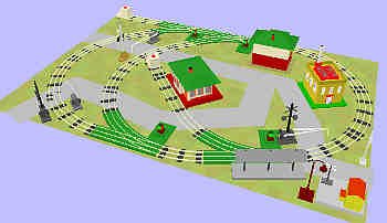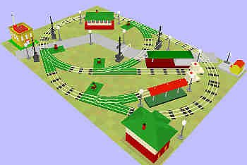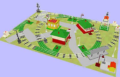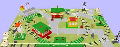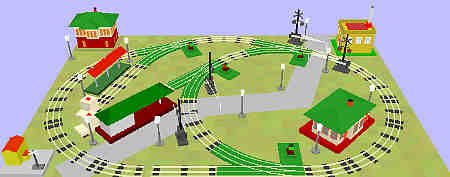 No vestiges here! Two spurs and two loops mean two trains. You can vary the action aplenty. (7) Standard gauge curve, 42in (3) Standard gauge Lionel #210L turnout (5) Standard gauge ½ curve, 42in (1) Standard gauge Lionel #210R turnout (1) Standard gauge medium-straight (2) Standard gauge straight (2) Standard gauge half-straight (2) Standard gauge #25 illuminated bumper (1) Lionel® 2129 freight station (1) Lionel® 2156 station platform (1) Lionel® 14152 #133 station (1) Lionel® 12713 gate man and shed (11) Lionel® 12874 street lamp (4) Lionel® 6-2162 crossing gate w/signal (1) MTH #437 switch tower (1) MTH #436 power house |
