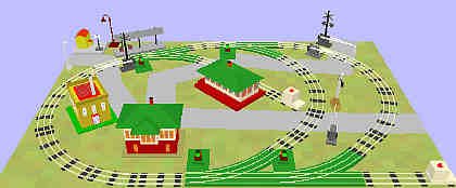 A double loop that is great for trolleys and streetcars. The one spur is more for appearances than practical use. (13) Standard gauge curve, 42in (3) Standard gauge half-straight (1) Standard gauge Lionel #210R turnout (2) Standard gauge Lionel #210L turnout (2) Standard gauge medium-straight (1) Standard gauge #25 illuminated bumper (1) Lionel® 12713 gate man and shed (1) Lionel® 14152 #133 station (1) Lionel® 12748 illuminated station platform (2) Lionel® 14147 station clock (2) Lionel® 22947 automatic crossing gate (1) Lionel® 12760 automatic hiway flasher (2) Lionel® 6-2162 crossing gate w/signal (1) MTH #437 switch tower (1) MTH #436 power house (2) MTH 30-1098 #56 lamp (3) MTH 30-1030 #59 lamp (6) MTH 30-1095 #64 lamp |
