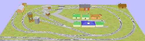 A slightly different variation, shown with a small town and outside spurs. (22) BachmannEZ 9 inch straight (3) BachmannEZ std righthand turnout (13) BachmannEZ R-18 30° curve (4) BachmannEZ 4.5 inch straight (7) BachmannEZ Hayes bumper (3) BachmannEZ #5 righthand turnout (1) BachmannEZ inch straight (2) BachmannEZ #5 lefthand turnout (2) BachmannEZ terminal straight (8) BachmannEZ R-22 22.5° curve (1) BachmannEZ #5 wye turnout (2) BachmannEZ 3 inch straight (5) BachmannEZ R-18 10° curve