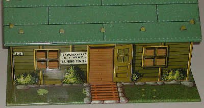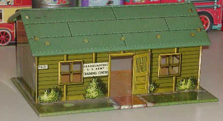 In the 1950s and early 1960s, the Louis Marx Company produced a grand array of historical and military playsets . The sets frequently included a tin-litho building. One popular theme for Marx was its "Training Camp" sets complete with soldiers, equipment, vehicles and a tin building. The simple building shown here is interesting, as the basic form was used for everything from construction sites to Wild West cavalry barracks. The only change was in the lithography itself. This particular building was one of the types of tin structures that might be included in various versions of the Training Camp playsets.