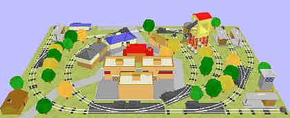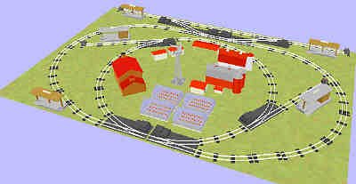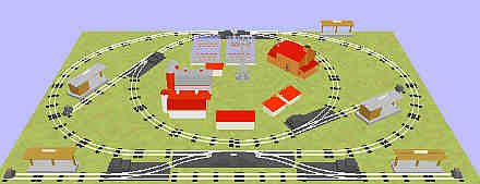 This pike uses loops and a bumper-to-bumper track at top. The top track can serve as sidings or a trolley line. (6) AF #700 straight (5) AF #720 remote left-hand turnout (20) AF #702 S-40 curve (3) AF #720 remote right-hand turnout (8) AF #701 half straight (4) AF #730 lighted bumper (1) Plasticville dairy barn silo (1) Plasticville #1622 dairy barn w/silo (1) Plasticville #1617 storage shed (2) Plasticville #1617 chicken coop (1) Plasticville #1617 corn crib (1) Plasticville #1617 dog house (1) Plasticville #1408 windmill (4) Plasticville #1804 green house (1) Plasticville 1700 two-story colonial house (1) Plasticville #1601 barn (3) Plasticville 1200 station platform (2) Plasticville 1620 loading platform |