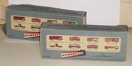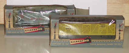 Here are a pair of Gilbert HO cars. Gilbert also made the popular S gauge trains. It made a foray into HO in the 1950s. |
