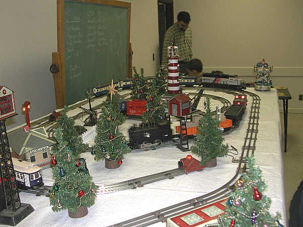 Here I am, running this little railroad.. In the foreground is a Marx tin gantry crane, to its right is a Marx operating crossing gate, and throughout are the stars of the show: trains. In front of me was the show favorite, the Industrial Rail trolley. I had to decorate all of those little Yule Trees. The tree's garland is actually beaded chain used on light fixtures. by the way.