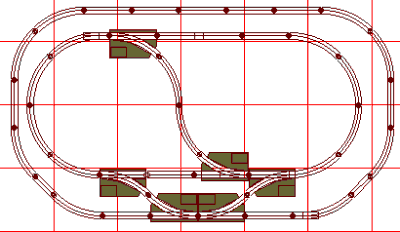 Another reversing track is the track bisecting the lower oval. Entering it, a clockwise train would end up running counterclockwise. The reverse loop in upper right corner would do the same. The reverse track uses same-hand switches, in this example both right-hand. |