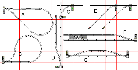 Basic shapes: A) Reverse Loop B) tight reverse loop C) adding turn to crossover D) Simple spur siding E) Double siding
