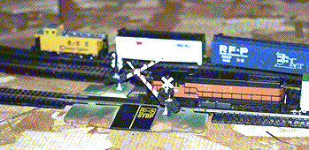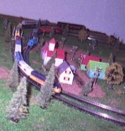 This entire N scale layout takes up only 32" by 60"! It took a couple of hours to do the roadbed, track and wiring, and a couple more to finish the scenery. We used Atlas track and switches, LifeLike operating crossing gates, LifeLike Grass, Earth and ballast, various brands of trees, houses, miniature vehicles and people. The diesels featured here are the Bachmann Chessie F9a (top right) and LifeLike Milwaukee SD7. In the third picture on the right, you might be able to pick out a Model Power Conrail C-420 moving parallel to the Chessie train.