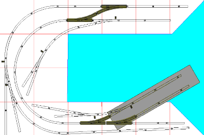 This 4' by 8' pike uses 18" curves. It is nice for both dock work and railcar ferries. The top siding would be the connection with the mainline freight carrier |