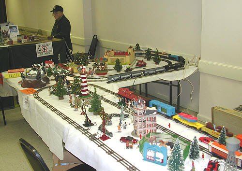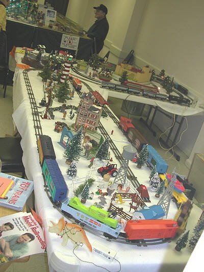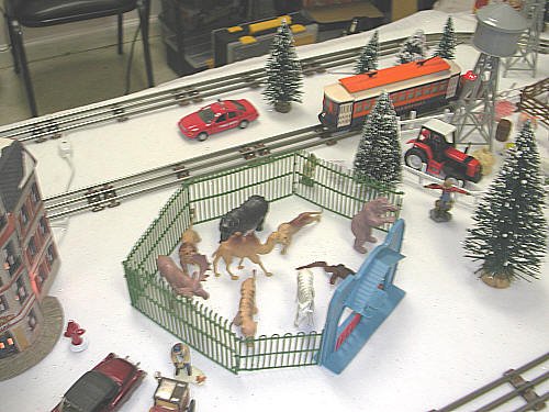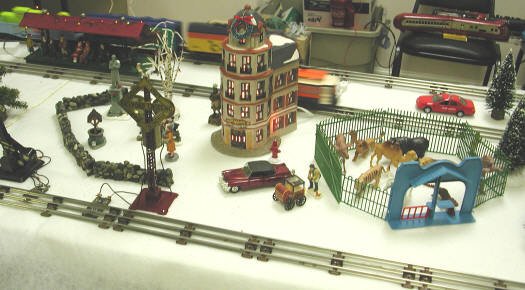 This is the fifth year we have hosted The Tinplate World Unlike the Crawfords and N-Trak, whose railways are already set onto bases, our railroad is set up entirely "on the spot." We decide upon an impromptu "track plan" and get to work. Thor does track and wiring, while Audrey emplaces small scenes and vignettes. Most of our trains and accessories are older vintage pieces.