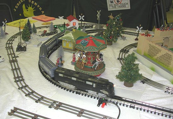 An NYC E7 hurtles past tin Oak Park Station and the Victorian Carousel, hauling a load of gray 6" tin NYC passenger cars. |