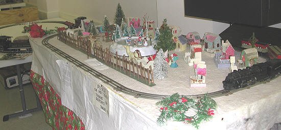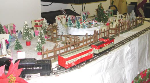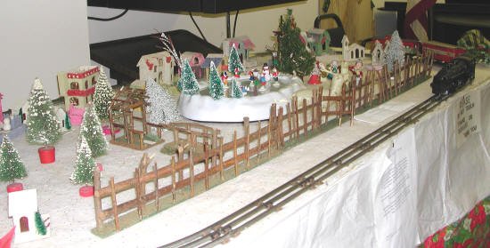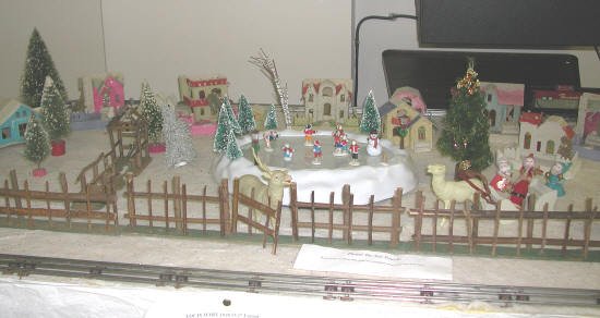 This railway was the work of Gary's wife, Dawn. It features vintage cardboard houses that were sold in the 1930s, 1940s and 1950s as holiday ornaments. Also displayed are old figurines and decorations, including the old plastic reindeers and characters. Never one to remain entirely in the past, it also hosts a modern skating scene.