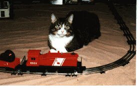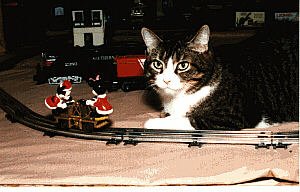 Sal over at Island Trains presented us with this gallery of photos of Sparkle, a happy cat who's favorite pastime is O gauge railroading. We think you'll enjoy seeing the furry feline at play!