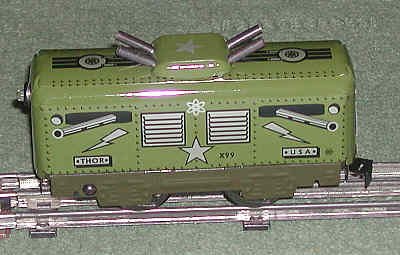 The Thor locomotive gunship is an excellent example of tin lithography. It is a smooth-running little locomotive that is loads of fun. Things like this are the antidote to O Scale two-railers and three-rail hi-scalers.