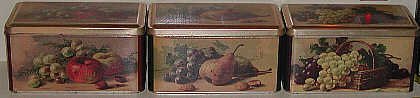 Modern tins decorated with still life art. |