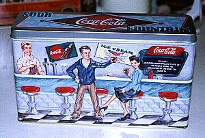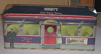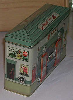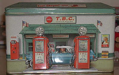 Diners and gas stations are a favorite theme of artists hoping to capture the not-too-distant past. Indeed, for many of us the old-fashioned diner is part of the daily routine. Naturally, these stops along the highway have become subjects for designers of tins. Our good fortune is finding some fine tins that are miniature diners and gasoline stations.