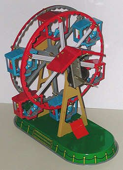 This is a modern copy of a classic tin toy. It is simple enough - wind the key and the ferris wheel turns.