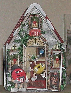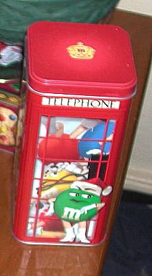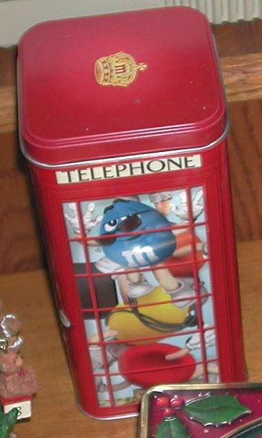 The inspiration for these tins goes without saying. They are whimsical representations of the candy that's not supposed to melt in your hand. The phone booth is very much like those from England. The house is hilarious!