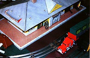 Tin litho station and automobile, with a tin crossing sign. |