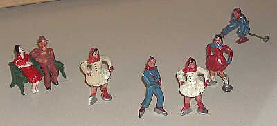 Tin people. The couple on the bench were sold as railroad station figures. The skaters and skiers were common "scenery" figures of the 1930s. |