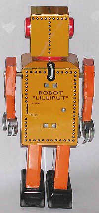 "Robot Lilliput". This one is a licensed remake of the original Japanese toy. The robot walks forward with a mincing gait, arms swinging with each step. Gauges, hoses and serial numbers are lithographed on. |