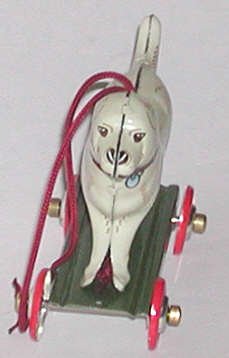 Toys like this were called "penny toys" in England. This dog has interesting lithographed details. |