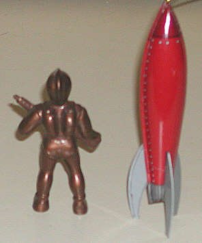 The rocket was sold as a tin Yule ornament, and has a yellow cord fitted to the top. It is typical of the rockets seen in old science fiction movies. Spaceman is from the same era, but he is made of plastic. |