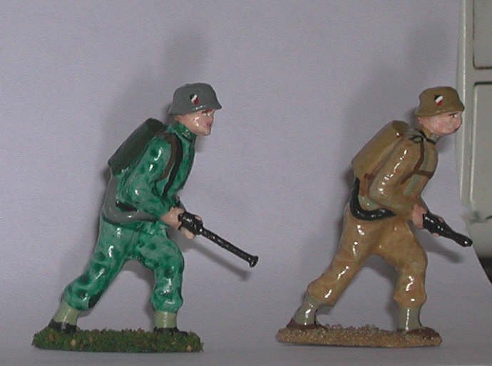Yes, folks, two Germans for the price of one. The one on the left is in the late war uniform, and the one on the right is pure Afrika Korps. All it took was filing the helmet of an American flamethrower man and doing a different paint job. For the Afrika Korps man, I used the Honeycomb paint trick. The main difference is that this fellow has black piping. Engineers / pioneers were the troops responsible for flamethrowers. They used black piping. His boots are like the short issued boot used with canvas leggings. German troops fashioend various kinds of leggings in the desert.