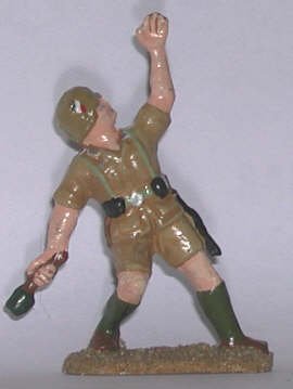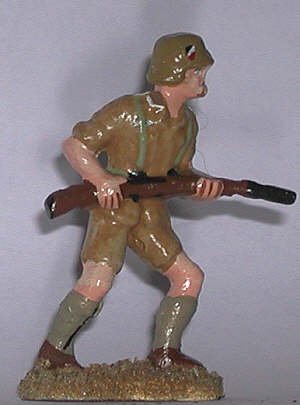 Castings Inc.'s mold 68103 "German Officer and Foot Soldiers" makes a German commander, a rifleman and grenadier. These are Afrika Korps soldiers. The figures were copies of a set made by Charbens, a British firm. These are toy figures in the truest sense, though they have a good degree of realism. Look at the Grenade thrower. His is one of the best animated poses I have seen of a soldier throwing a stick grenade.