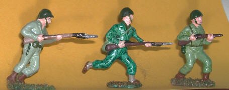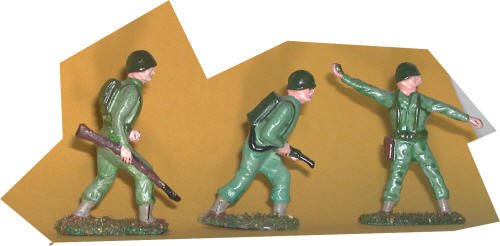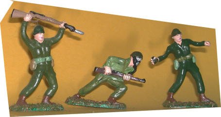 Trench Raiders Enemy troops like to set up trench lines between bunkers. Clearing those trenches is dangerous work. This trio of troops is ready for the job. There's a man ready to toss a grenade into an enemy dugout. Beside him is a soldier engaged in close combat with rifle and bayonet. The third man rushes forward to strike at the enemy before they have time to react. This action-packed set has three of the classic poses of genuine toy soldier art. They are copies of some of the most popular toy soldiers of the 1960s and 1970s. The old "Tim- mee" soldiers were sold by the bagful for many years. Today we offer our hand-painted versions of them for your collection. One thing: the Tim Mee figures stand a head taller than the average toy soldier. They are a bit less detailed, but just as animated in their poses. What you get is a set of popular soldiers which are pure Toy Soldier Art. Cool poses. Cool paint jobs. Cool art. The fun begins when you take them out of the box. But then, with these guys it has been going on for almost sixty years