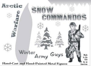 Snow Commandos Winter warfare brings a whole new set of conditions to warriors. The freezing temperatures and snow-covered landscape make their own demands. Troops must be trained for warfare in winter and arctic conditions. The usefulness of well-trained soldiers in winter was shown by the Finns, who wreaked havoc on the invading Russian army by using winter to their advantage. Every modern army takes great pains to prepare men for Winter. The annual exercises in Alaska kept the US Army and Marines ready for cold weather combat. NATO allies train for winter in the Norwegian glaciers. Troops are given white uniforms to blend with the snow and special insulated gear to keep off the chill. The Snow Commando set includes with an officer, submachine gunner and automatic rifleman. They are dressed in white winter gear, ready for action in snow and ice. These snow commandos rule the frigid places. There is a set here for you to add to your collection. The fun starts when you open the box!