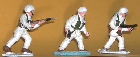 Army Blokes are painted in the uniforms of World War II. The green-tinged field gear