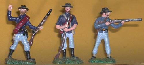 The uniforms of Civil War units were similar in cut, but varied in details such as color and other enhancements. So it is that Union and Confederate units' uniforms sometimes differed only in color. npcomments-->npcomments-->npcomments-->npcomments-->npcomments-->npcomments--> Our Civil War Union figures are painted with regulation blue tunics. They are a trio of classic fighting men, each armed with a classic rifle and sporting authentic equipment. You get a firing rifleman, NCO waving the men forward and a solder standing with rifle. Of course, the real fun comes when you take the out of the box