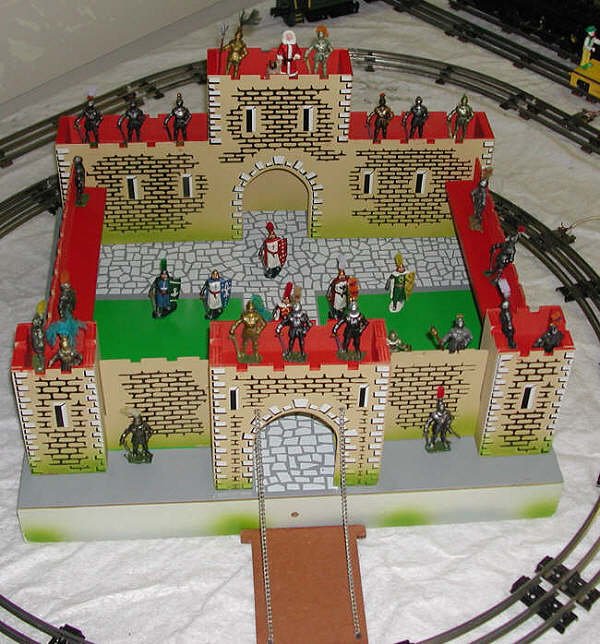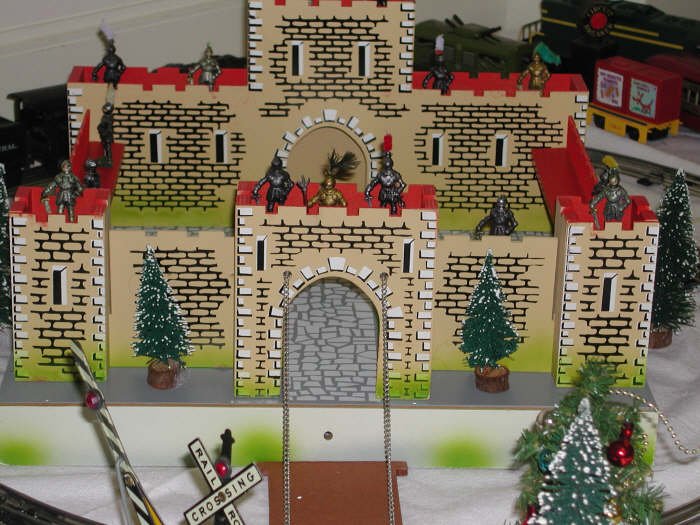 Situation? Every year during the Yule season we participate in a train display at Ocean Grove, NJ. We run the old O gauge and O27 trains, hence the odd track. This castle is a popular part of the display. Knights and trains? The children like it.