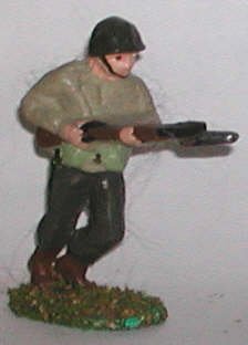 This is an American soldier charging with fixed bayonet. The cut of his uniform and his equipment Tell us he is American circa 1942 - 1950. The color tells us that he is a World War II soldier. Khaki Tan jackets were not used after 1945. |