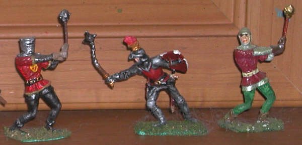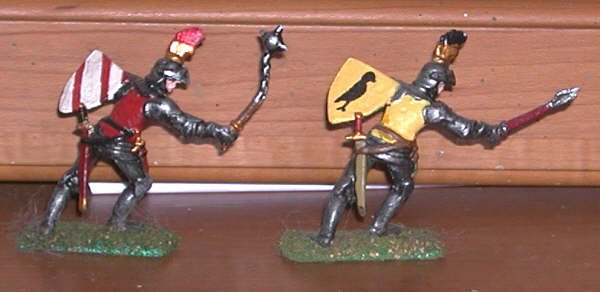 The above knights were designed in the 1940s as toys. They are from the Castings Inc three-cavity mold. They were copied from a Timpo figure. The pose is very basic, yet very good. The details make this fellow a charm. He has armor similar to the "maximillian" type. The ridges give it extra strength. Our knight has to be given a weapon, and I have provided him with a variety of axes and maces. Knights in fighting poses are popular for obvious reasons.