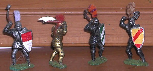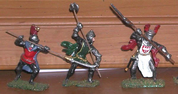 This trio is copied from the Britains "Deetail" line of knights, Castings Inc sells the molds to make these in metal. They look good, but they have their errors. Britains made them as a sort of fantasy Crusader army to fight an equally fantastic set of armored Turks. In the mix, historical reality was thrown out. The original poses were good, but a little work made them better. I replaced all three knights' shields and weapons with various two-handed pole arms. Two knights have glaives and one has a pole axe.